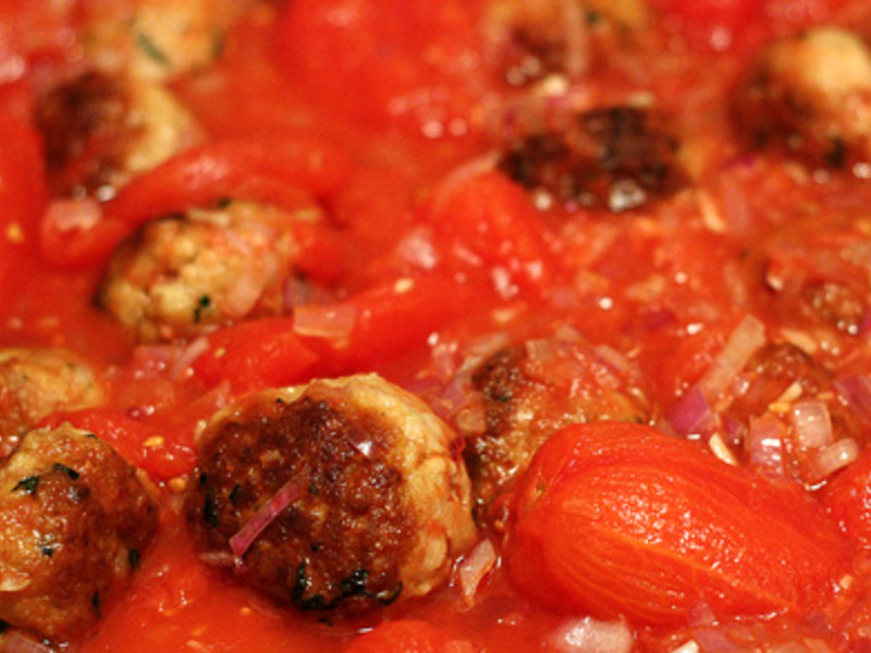 - Rastorni sosul intr-o tava, iar peste sos asezi chftelute rotunde mici facute din amestecul tinut la rece. Bagi tava in cuptorul incins pentru 30 de minute, apoi presari verdeata tocata marunt si servesti.