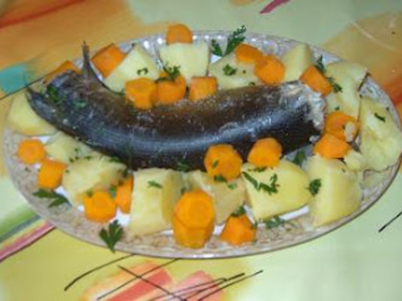 - Se pune apa sa fiarba cu morcov, cepa si telina. Cand legumele sunt fierte, se introduc bucatile de stiuca, sare, piper boabe, patrunjel verde tocat fin si unt.