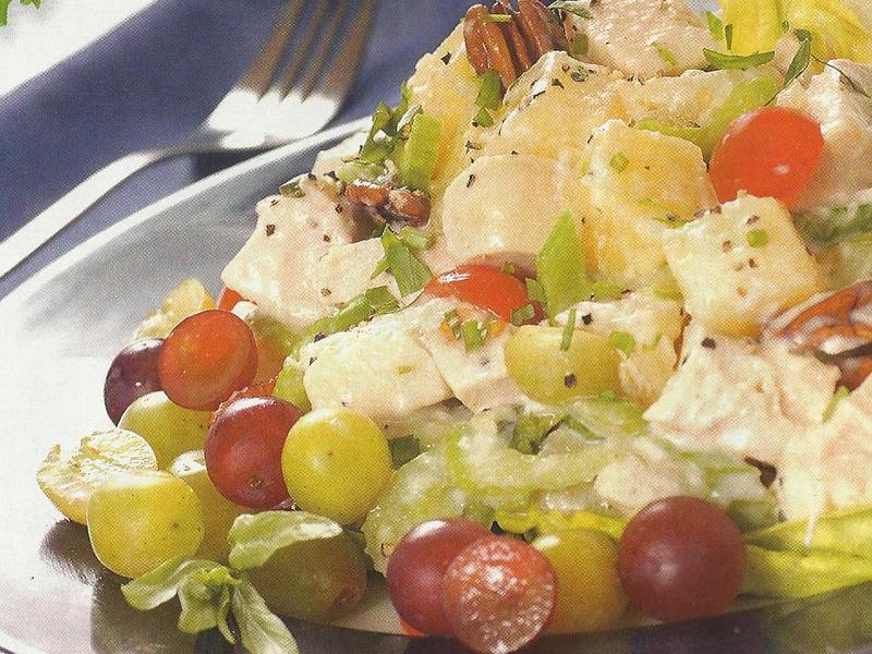 - Cartofii cand sunt fierti, adica se infige usor furculita, se scurg de apa si se lasa sa se raceasca, dupa care se curata de coaja si se taie cubulete care se pun peste salata verde. Se adauga boabele de strugure taiate pe jumatate, nucile si branza telemea taiata cubulete.