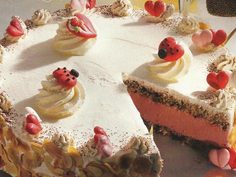 - Dupa 2-3 ore cand gelatina s-a inchegat, se scoate tortul din forma si se imbraca in frisca. Marginile se inbraca in fulgi de migdale sau in nuca macinata. Se fac floricele din frisca si se decoreaza cu figurinele din martipan. Se preasara pe margine putina cafea macinata si se pastreaza la frigider pana in momentul servirii.